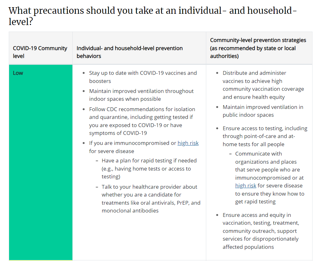 CDC changed its method for determining transmission rates to reflect current data on vaccine effectiveness on the current variants of concern with severe disease and hospitalization rates. Based on these new definitions, Loudoun County is now categorized as an area of low level transmission. CDC guidance in areas of low level transmission do not include specific masking recommendation, but does state generally, “Wear a mask based on your personal preference, informed by your personal level of risk.” (see below).